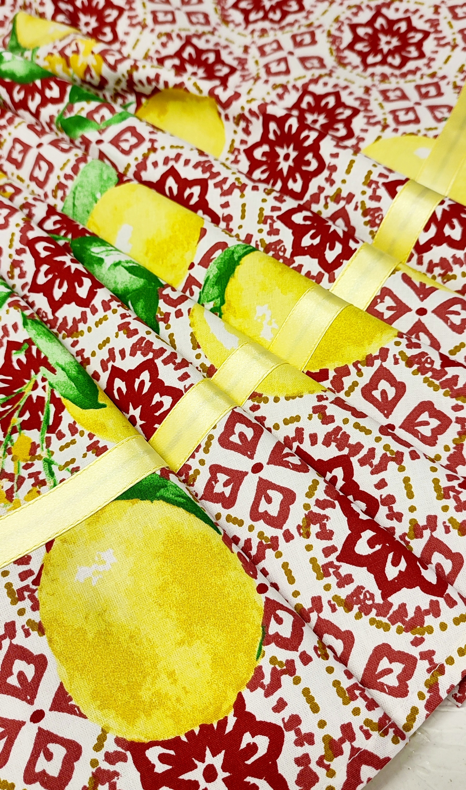 Materiál je plátno (100%bavlna), se vzorem citronů na bordó vzoru "dlažbě", to vše na bílém podkladu.