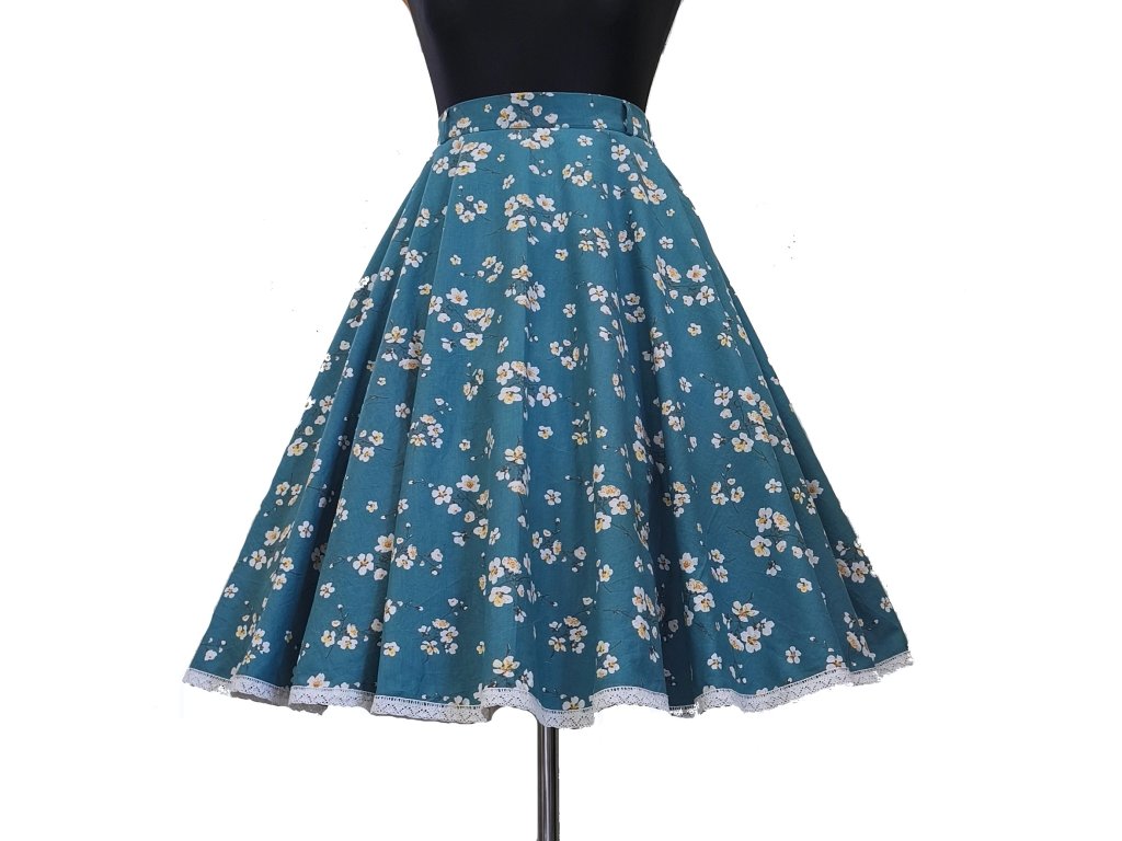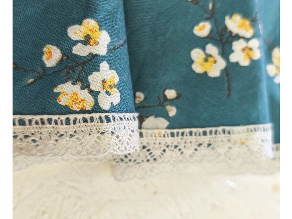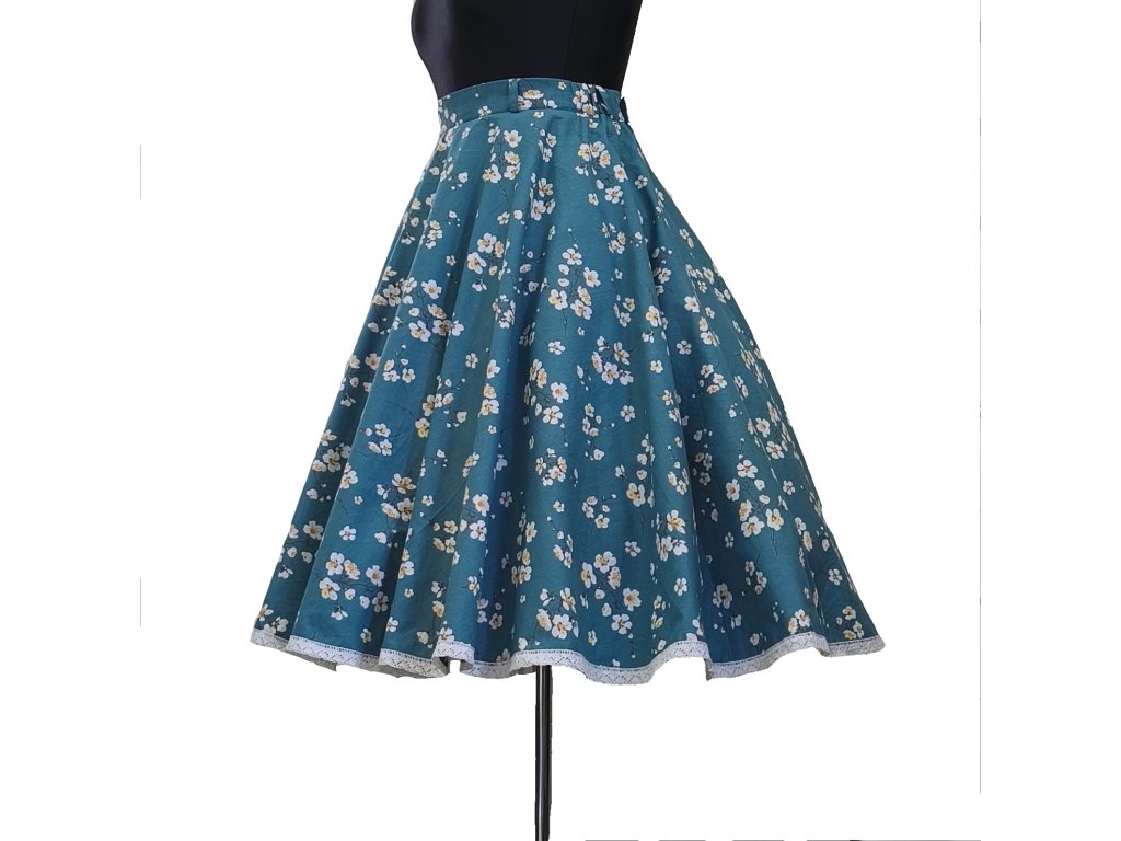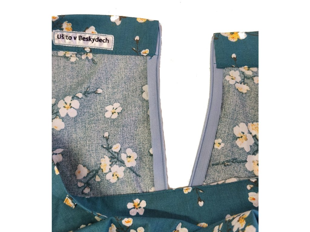 Materiál je plátno (100%bavlna), se vzorem bílých kvítků na modro-tyrkysovém podkladu. Dolní okraj sukně je zdoben bílou bavlněnou krajkou.