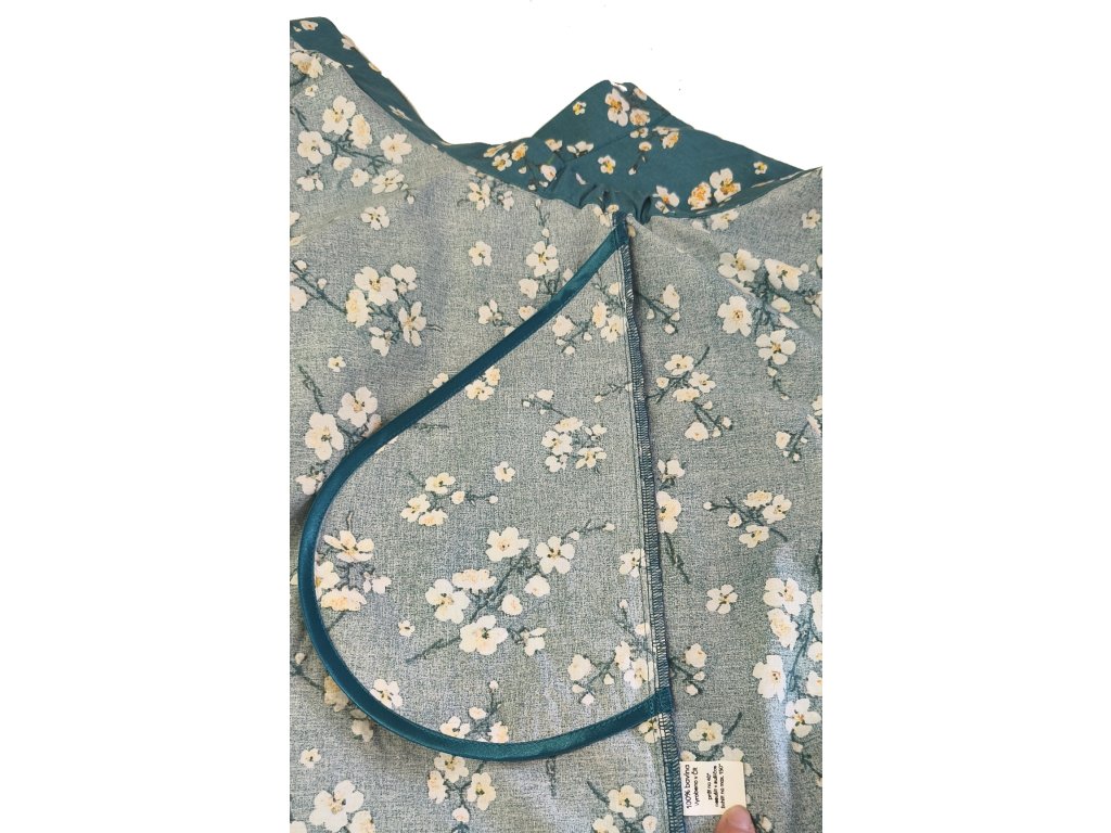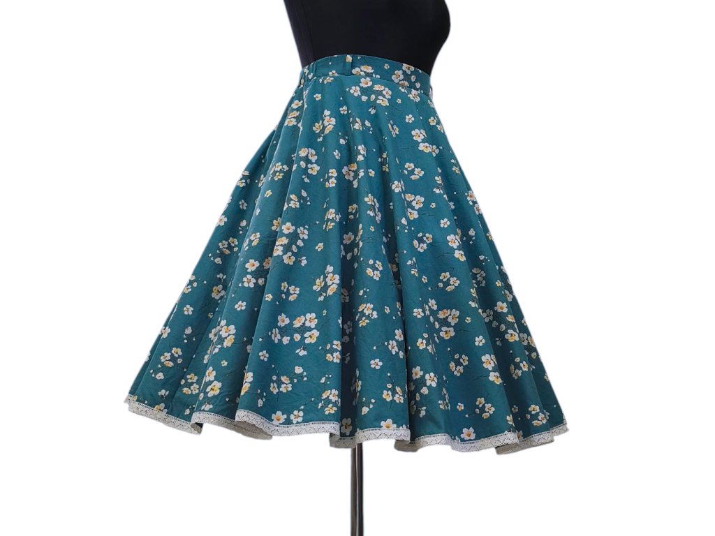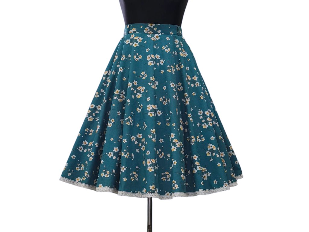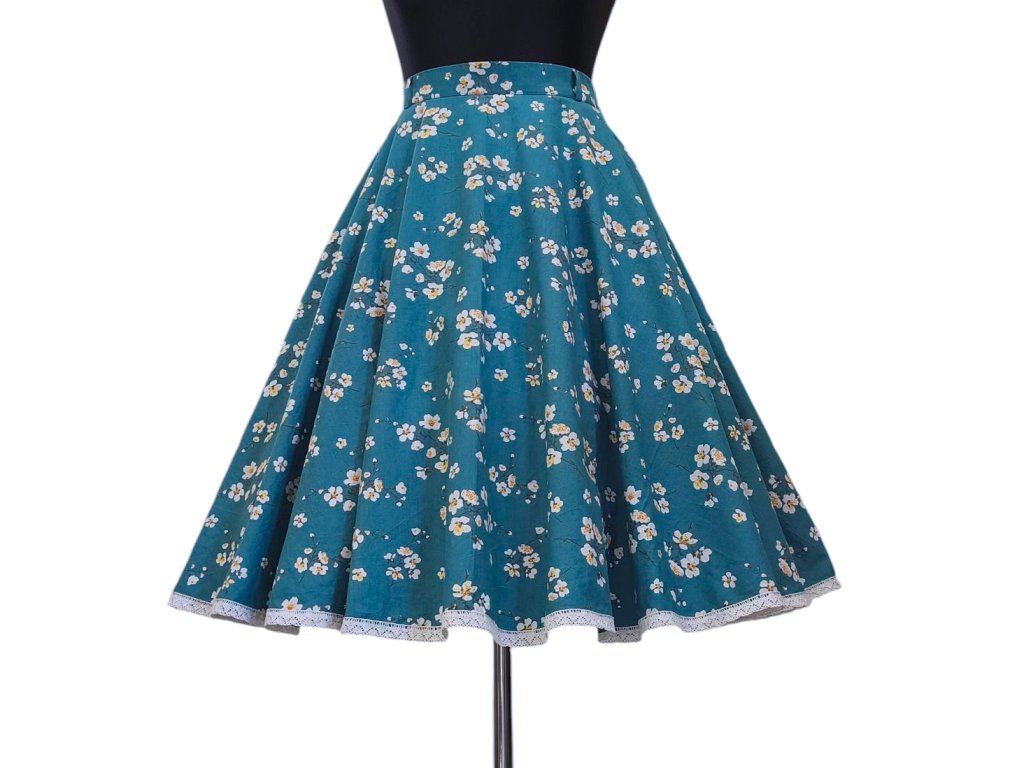 Materiál je plátno (100%bavlna), se vzorem bílých kvítků na modro-tyrkysovém podkladu. Dolní okraj sukně je zdoben bílou bavlněnou krajkou.