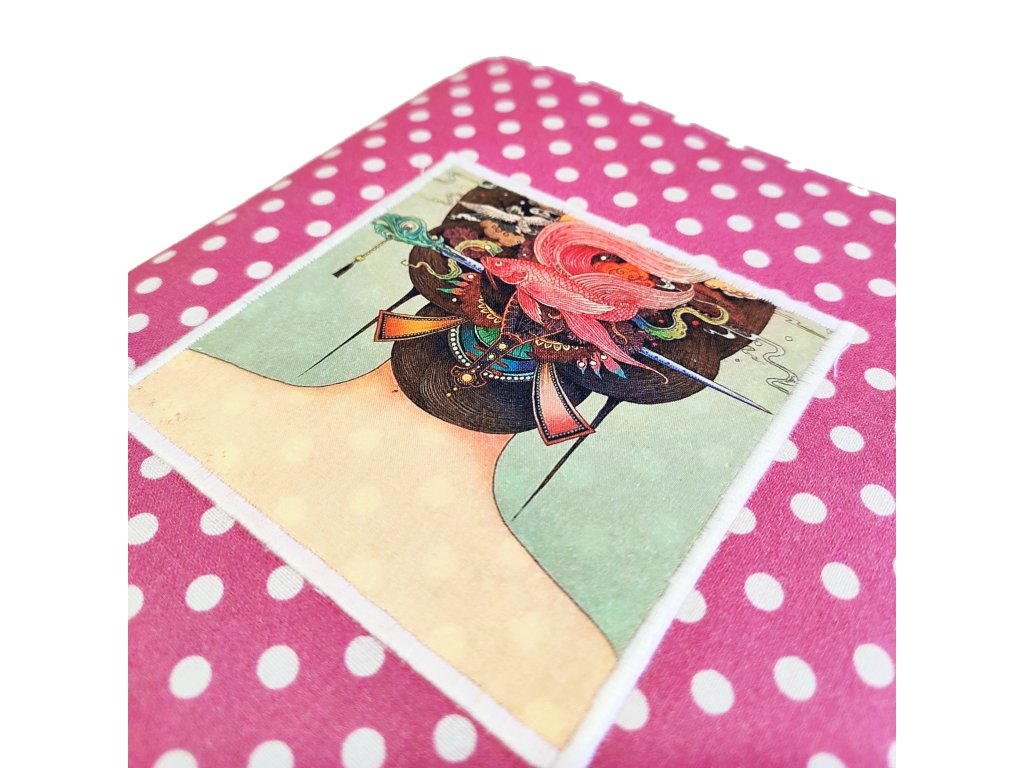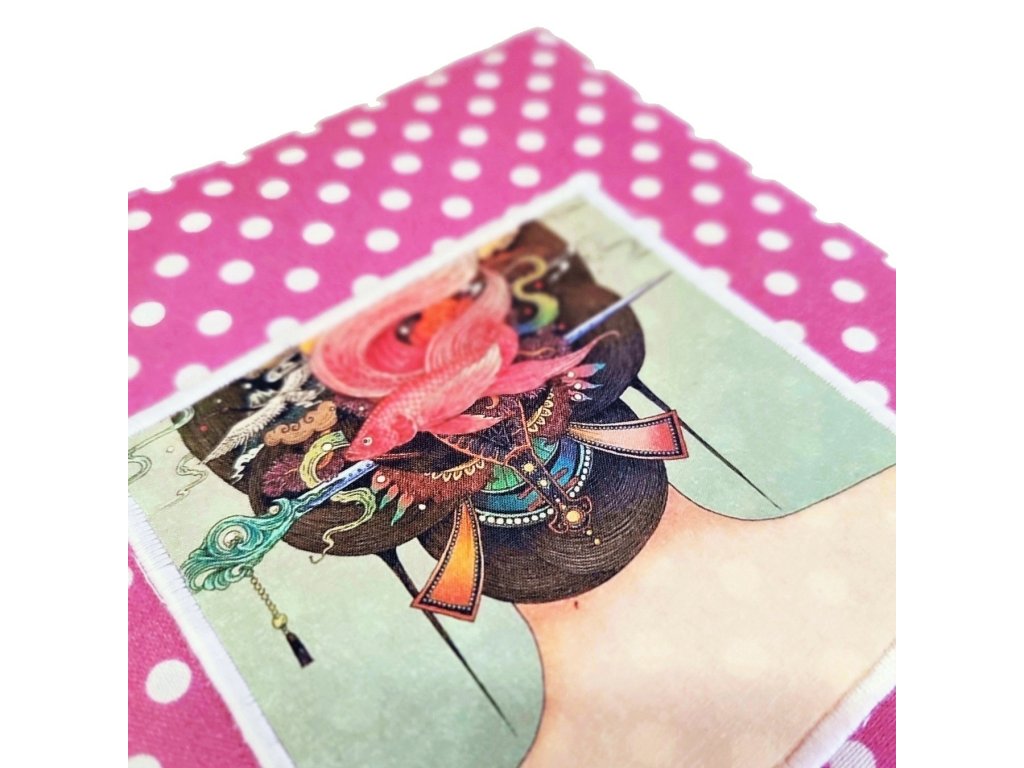 Obal je vyroben ze 100% bavlny, růžové barvy s bílými puntíky. Je zdoben obrázkem na šíji ženy s klasickou japonskou sponou a japonskými tradičními znaky.